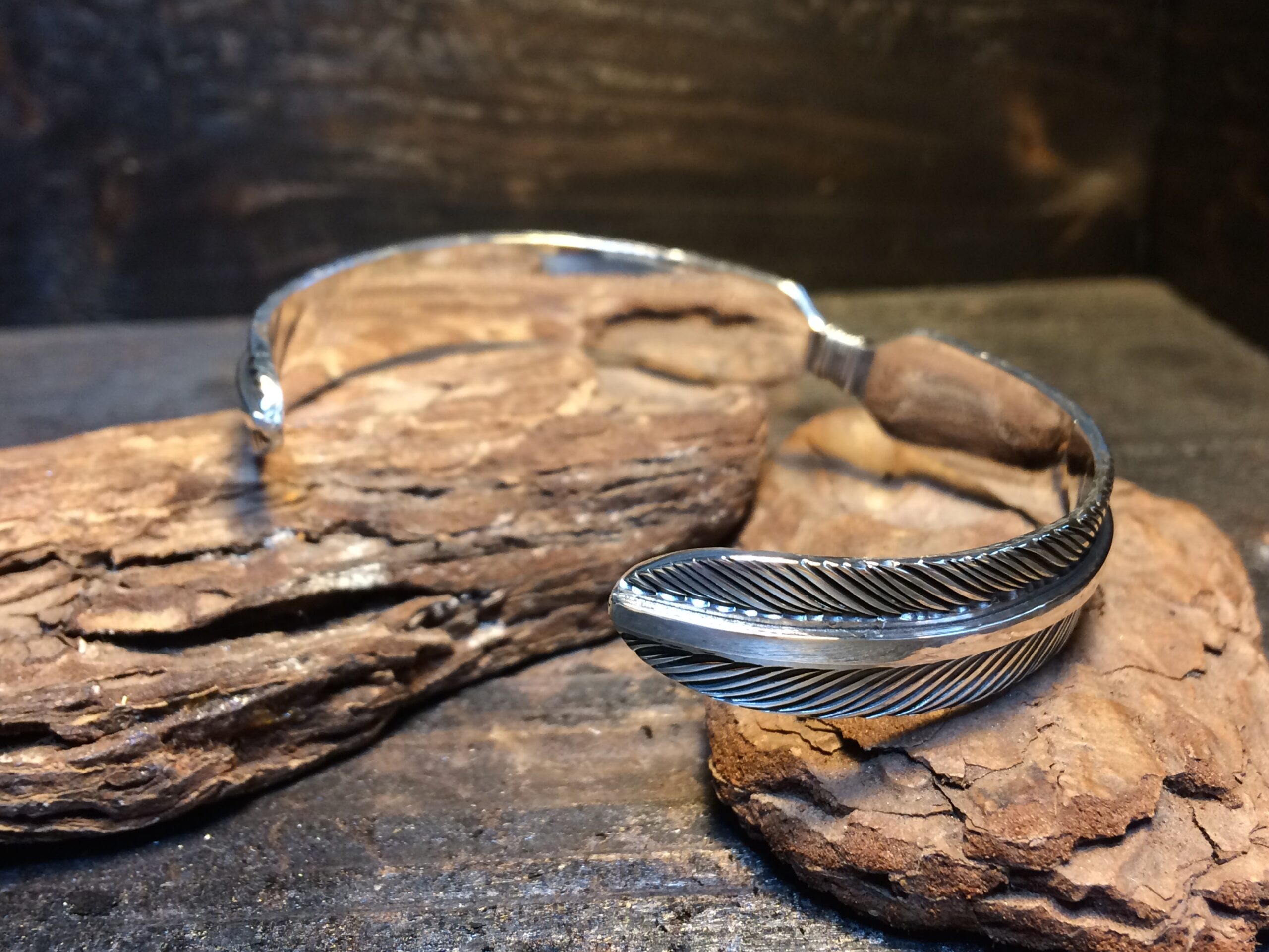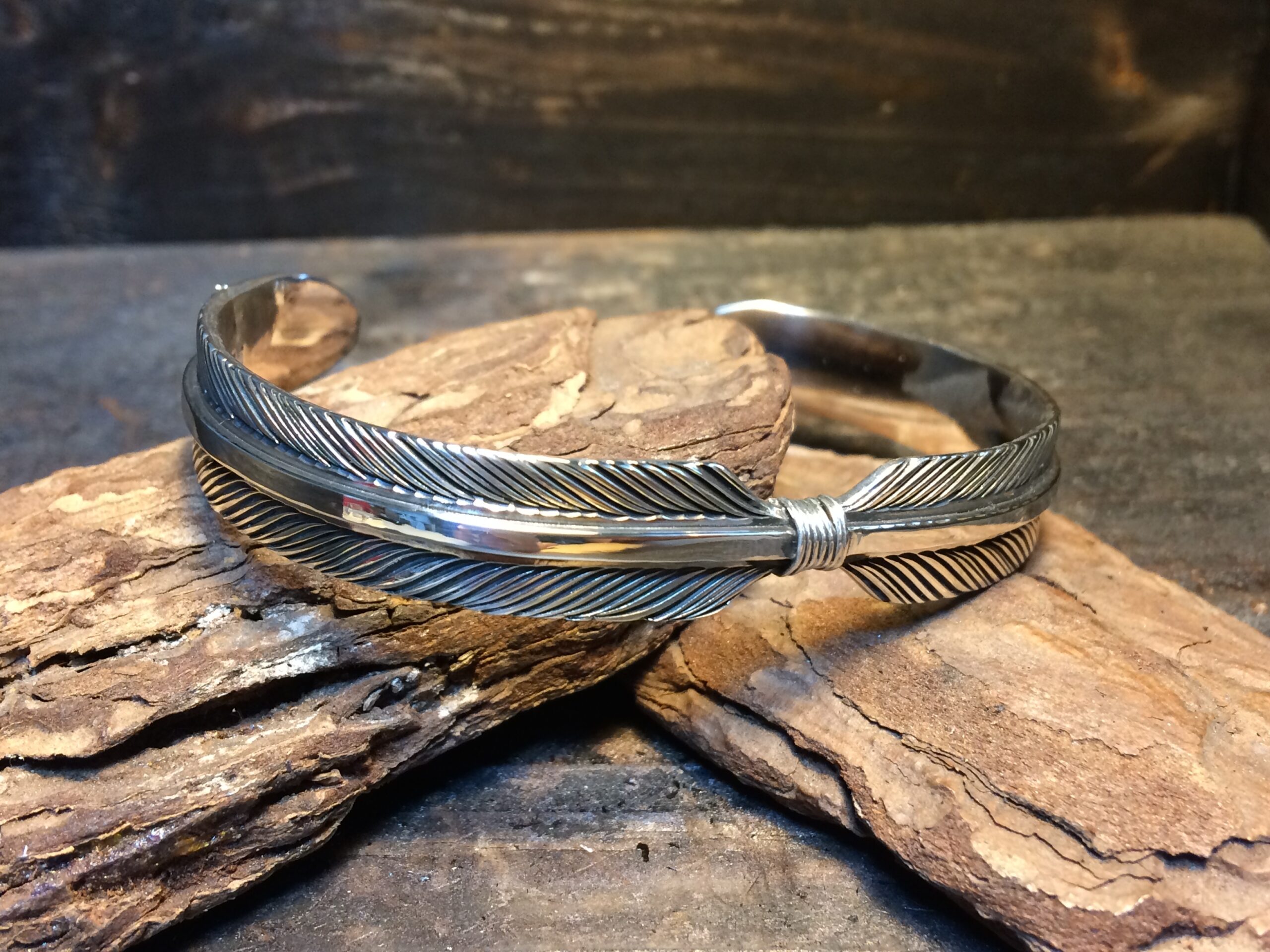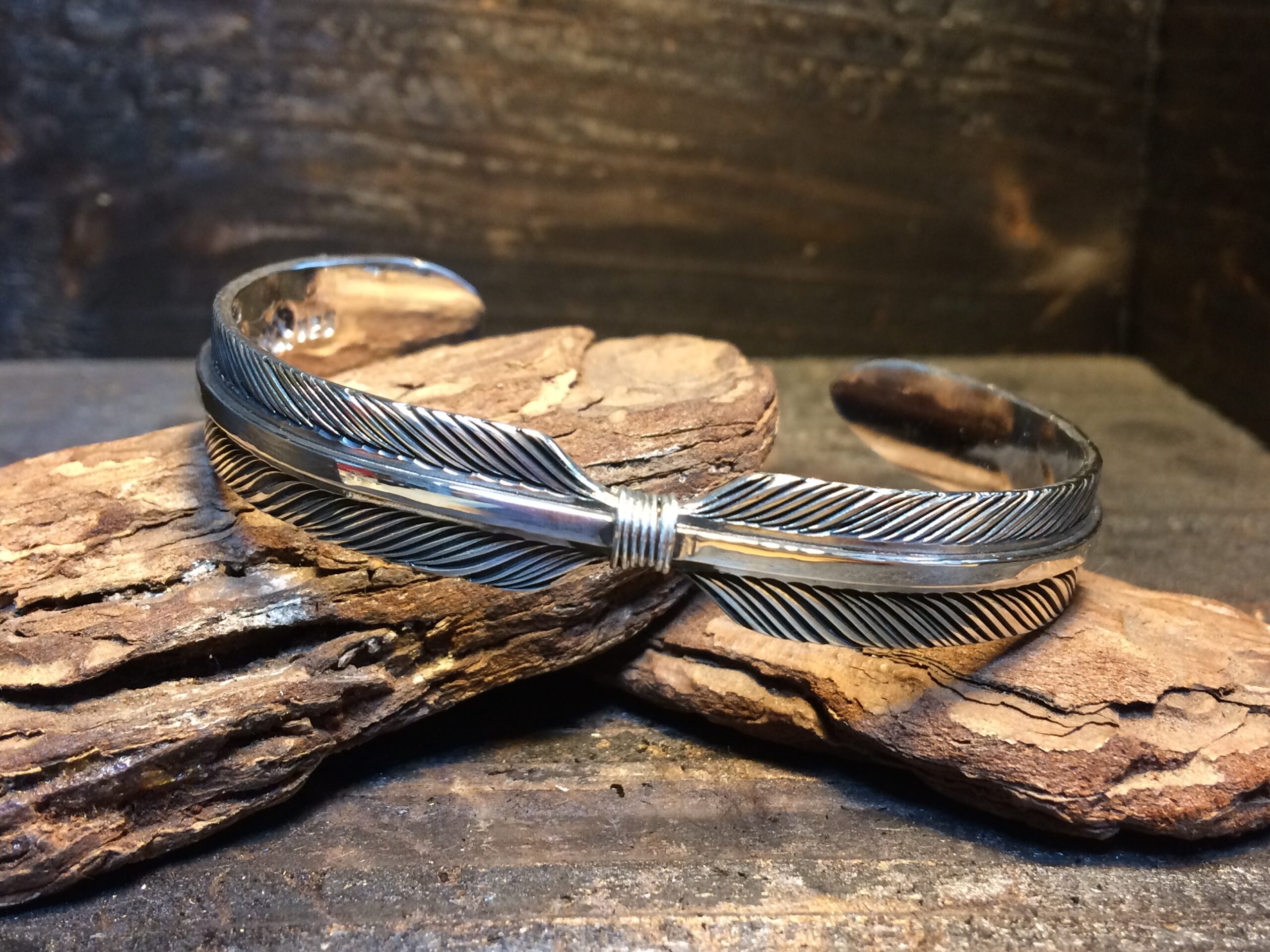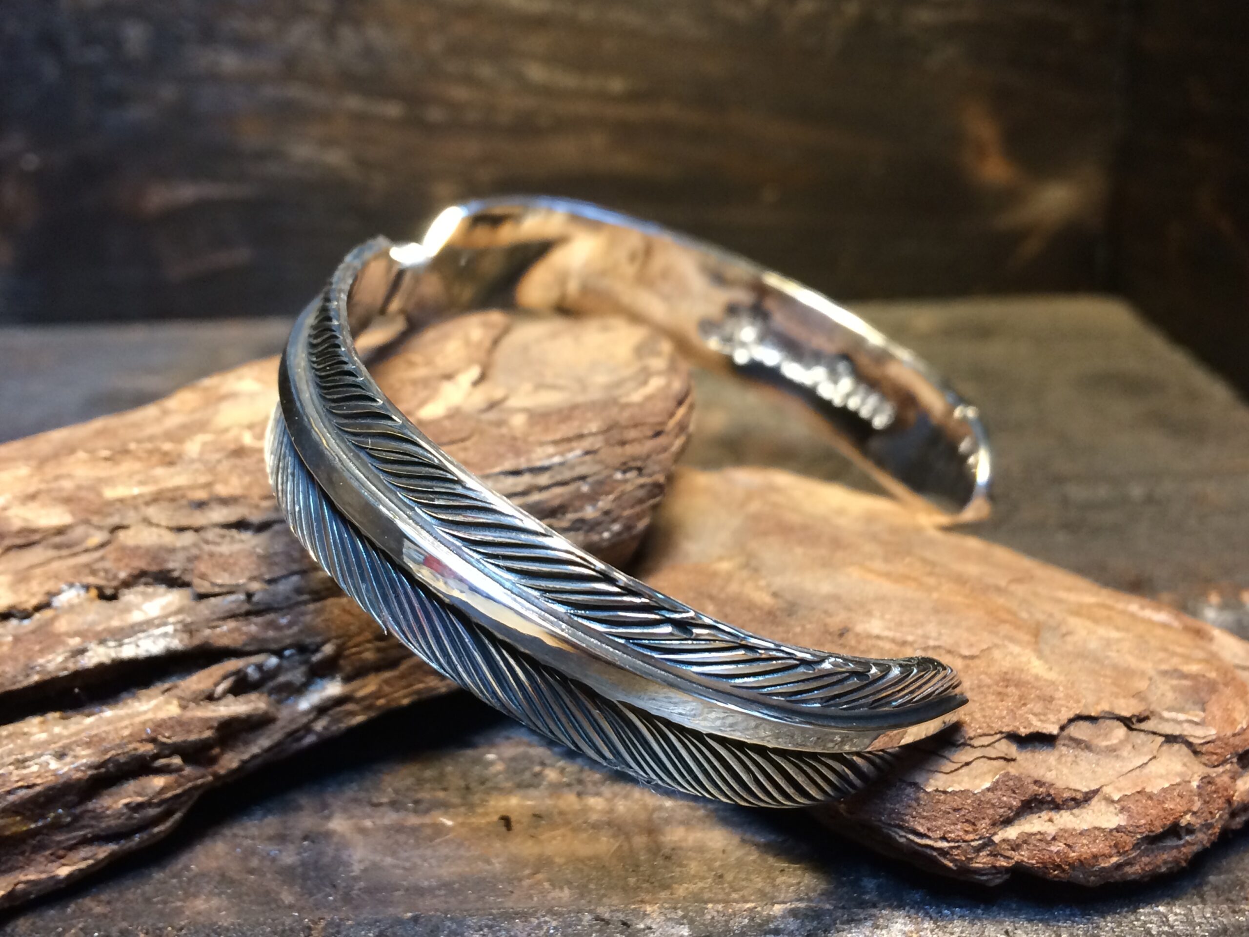 二枚のフェザーが一対となったデザインのバングルです。