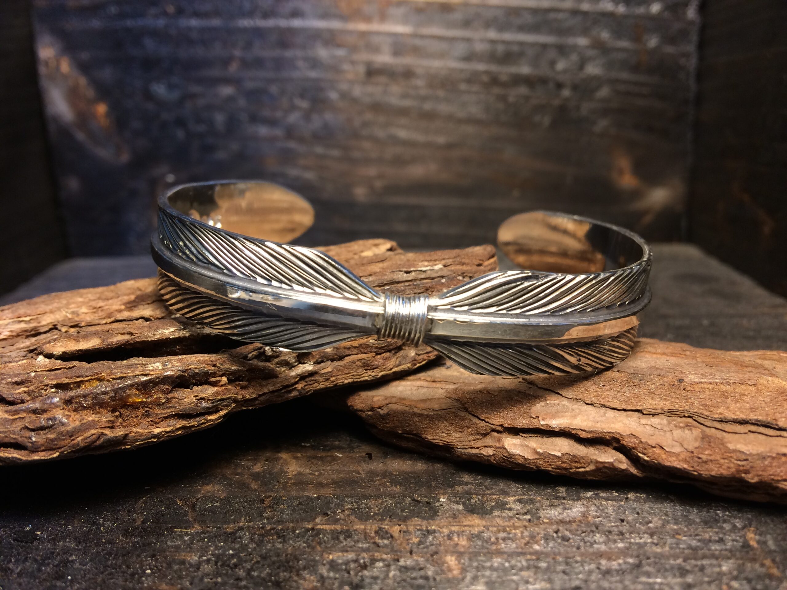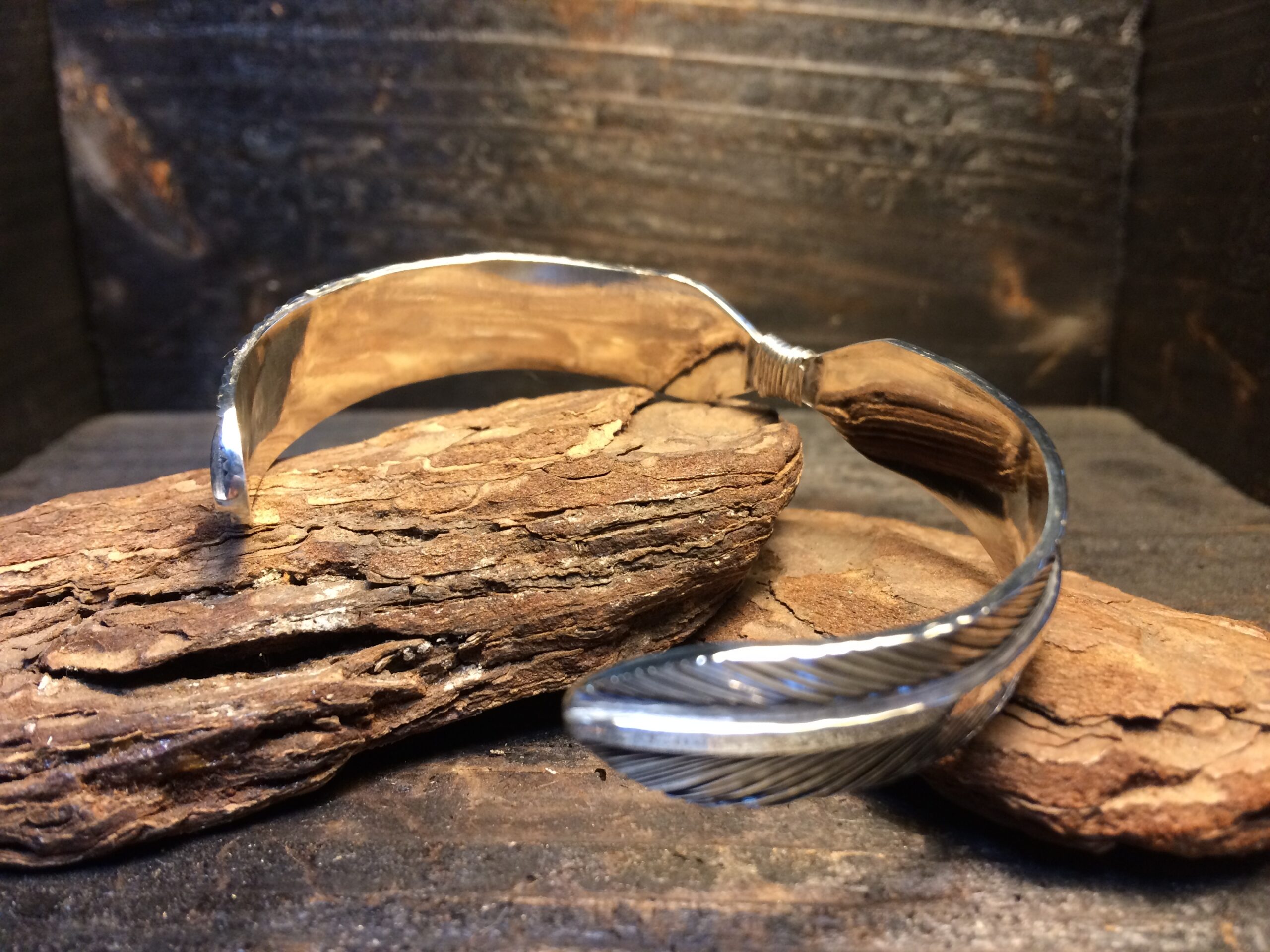 二枚のフェザーが一対となったデザインのバングルです。