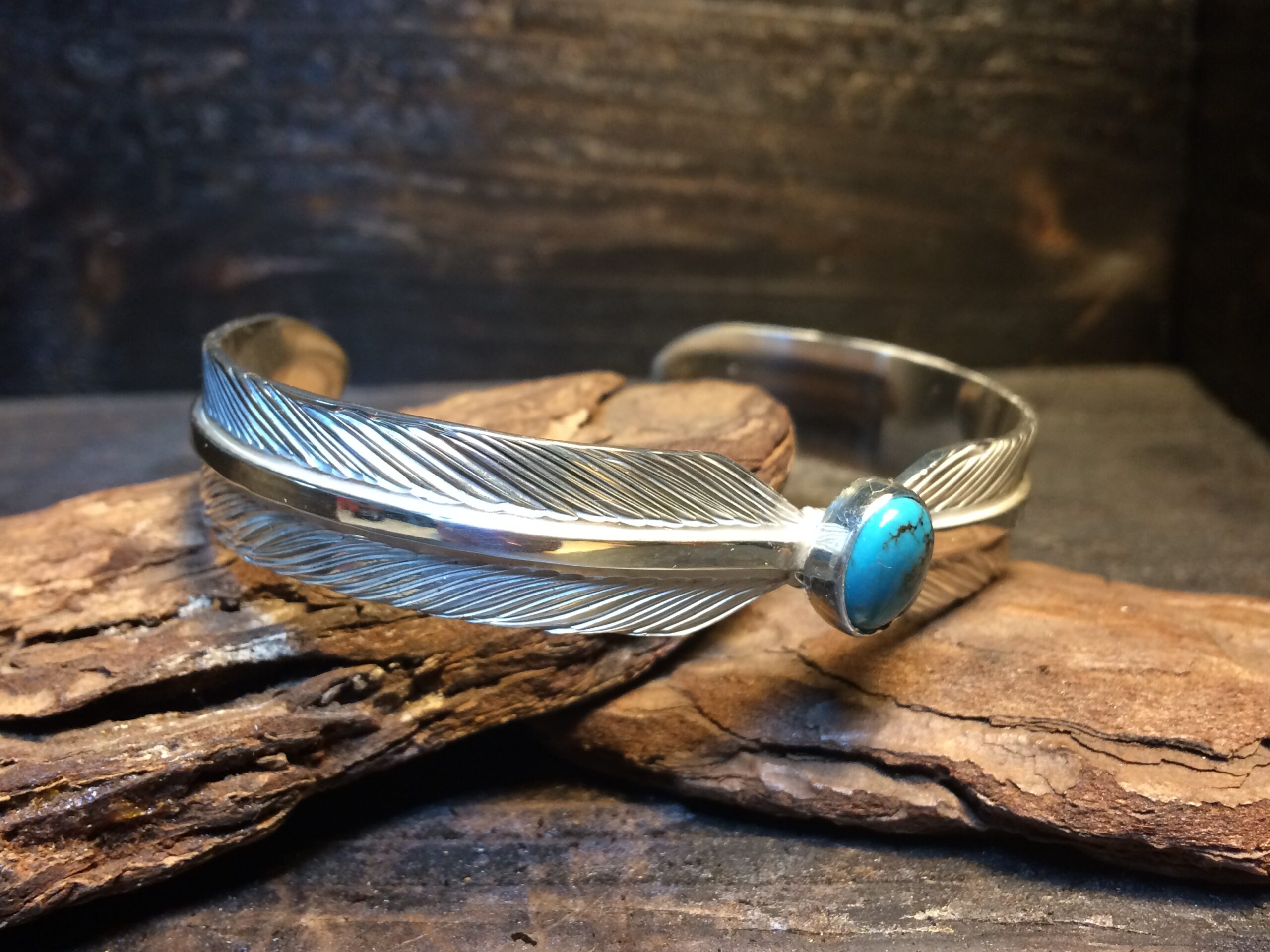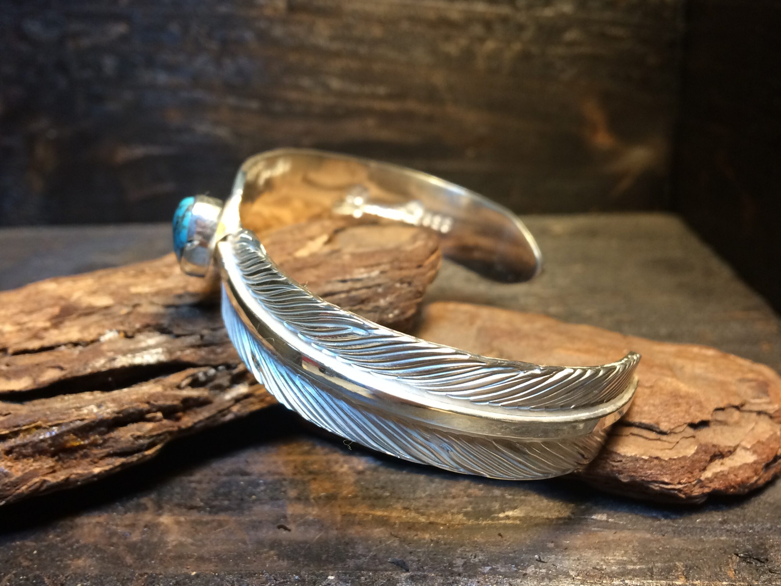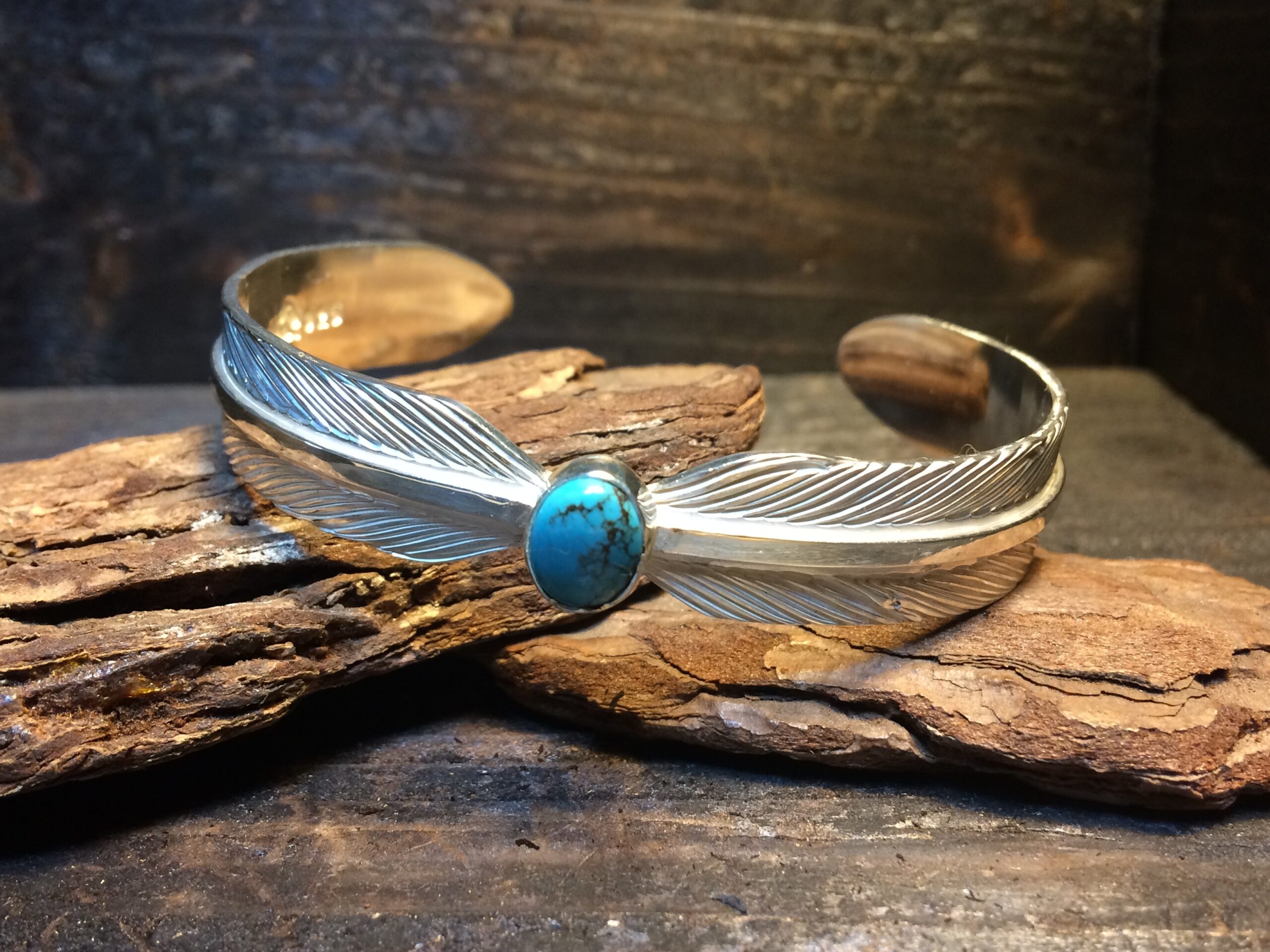 二枚のフェザーが一対となり、中心にターコイズをセットしたデザインのバングルです。