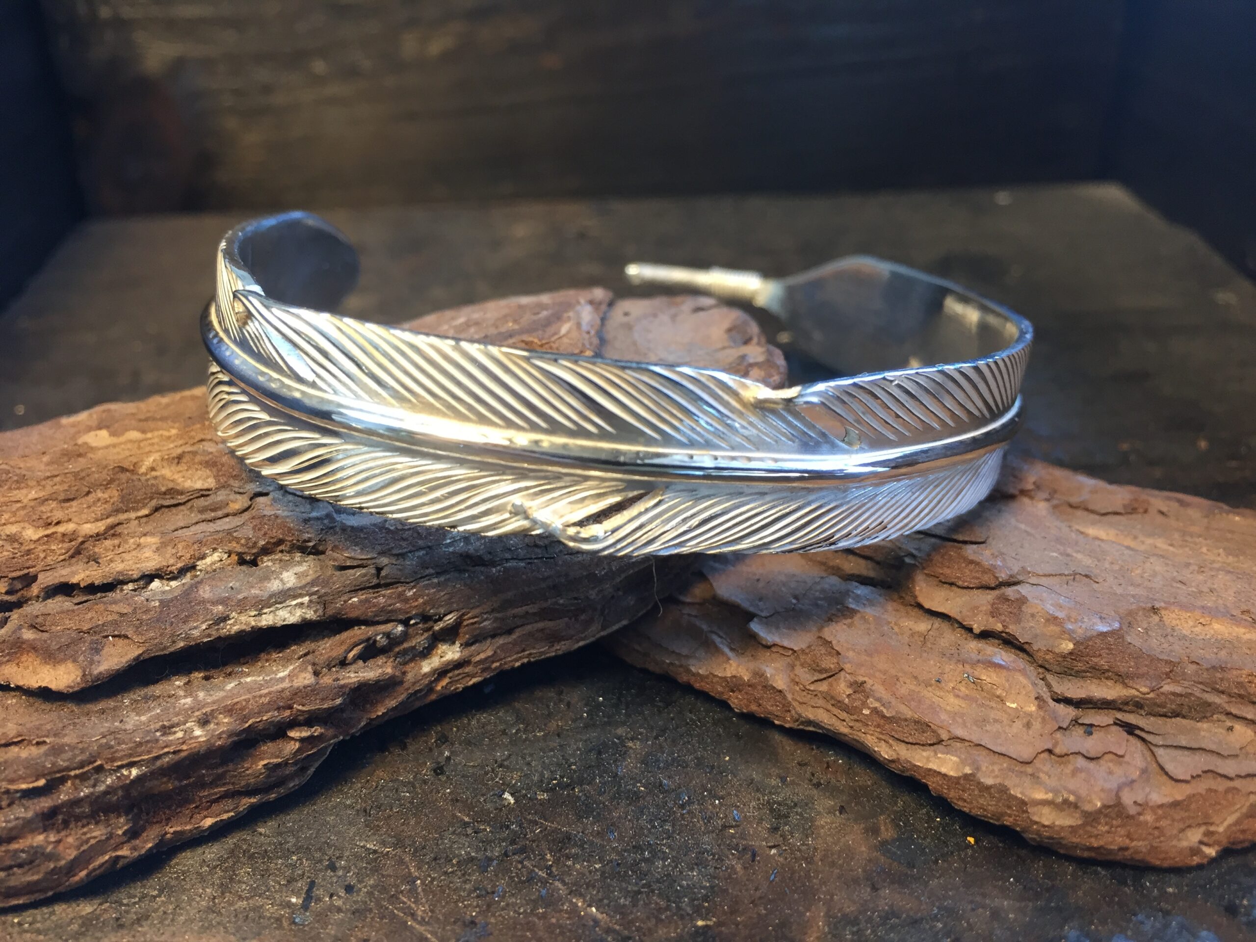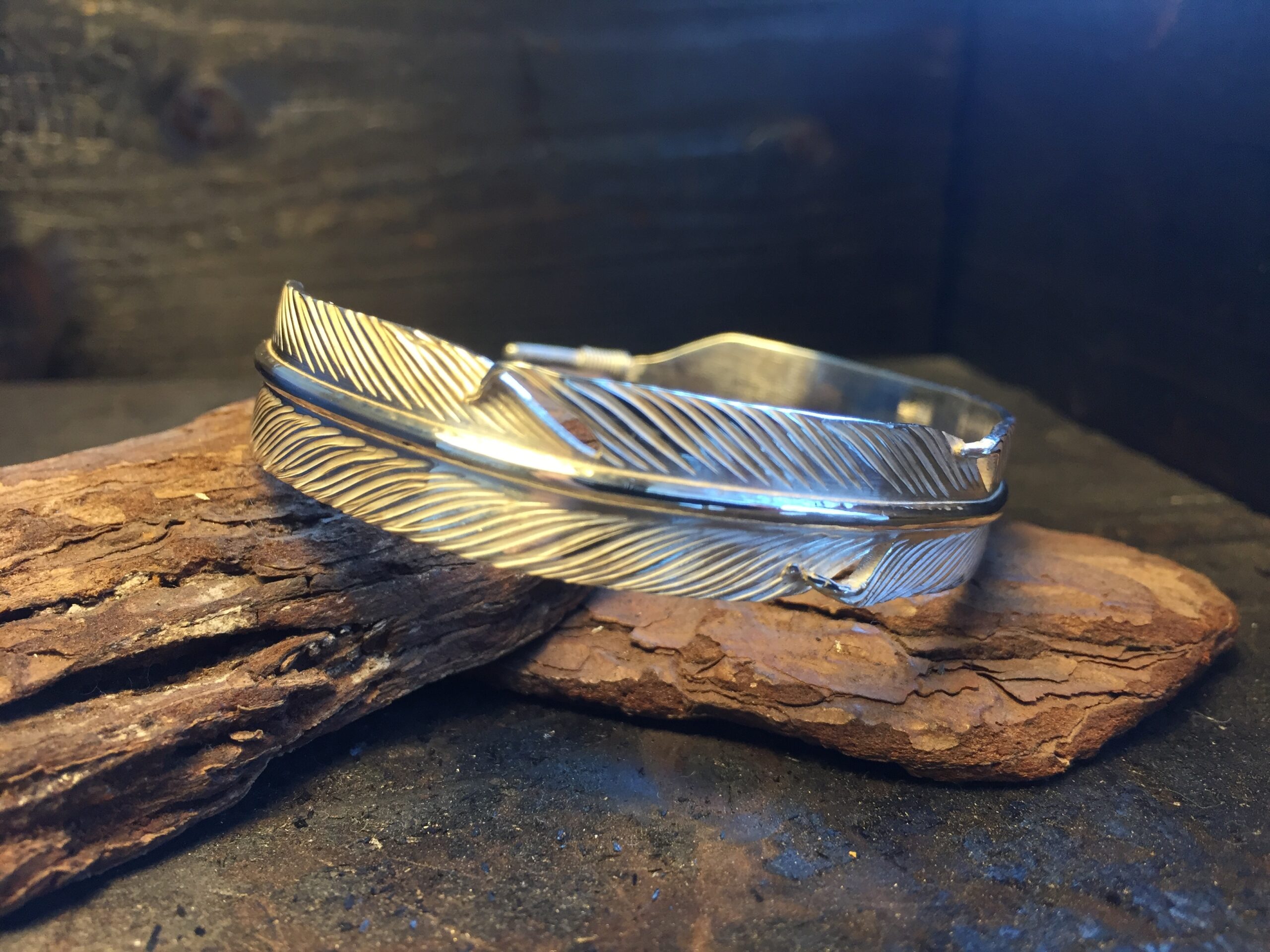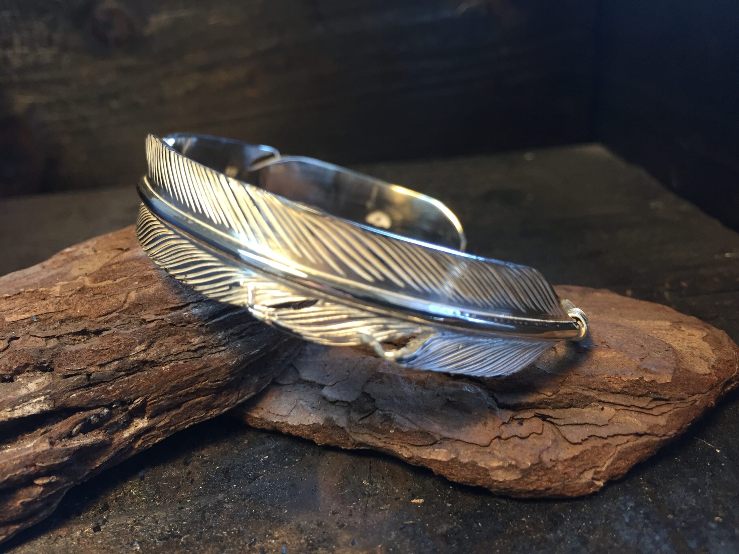 一枚のフェザーが手首に巻きつくようなデザインのバングルです。