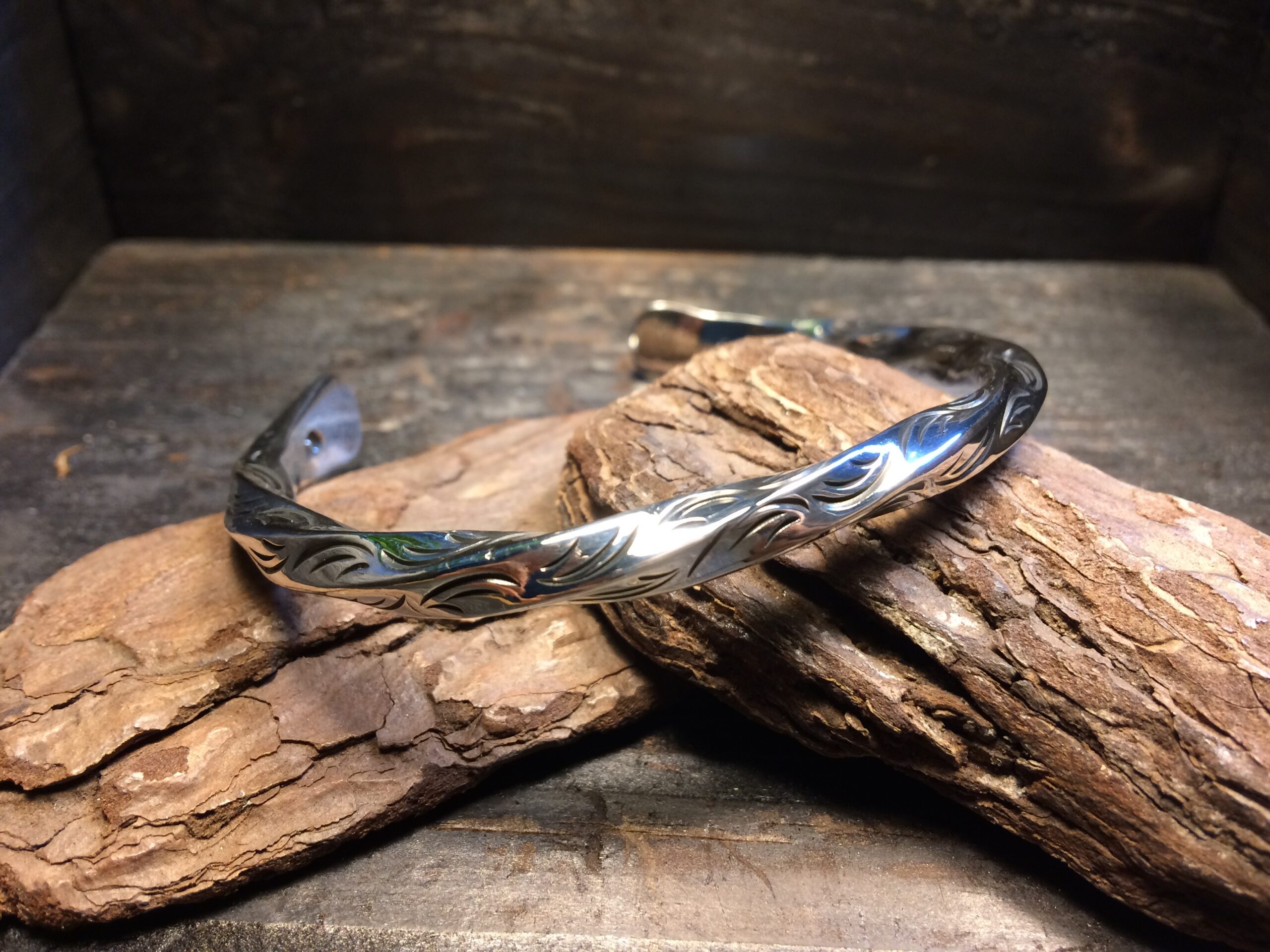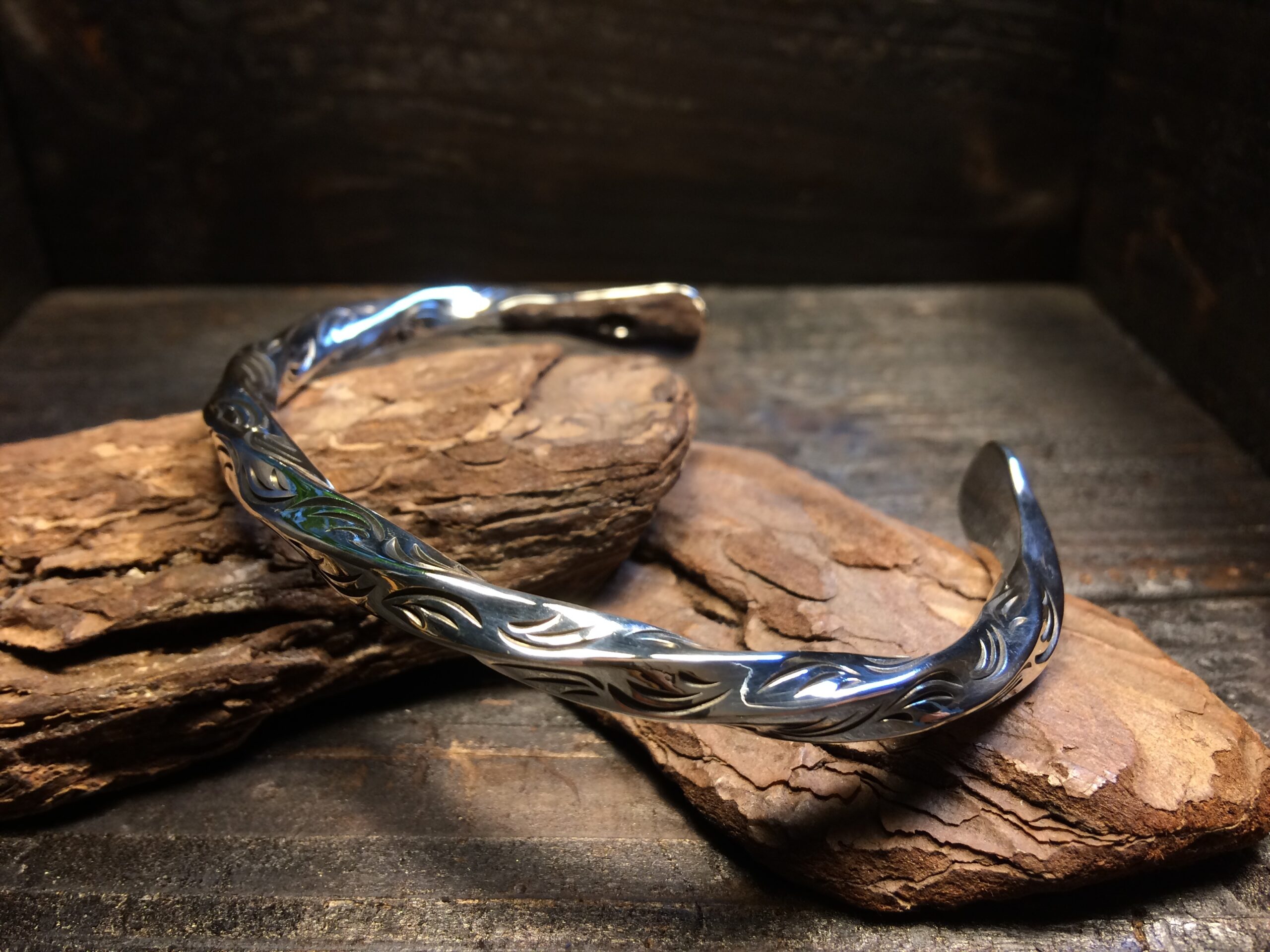 ツイストした角線に唐草模様を彫り込んだバングルです。